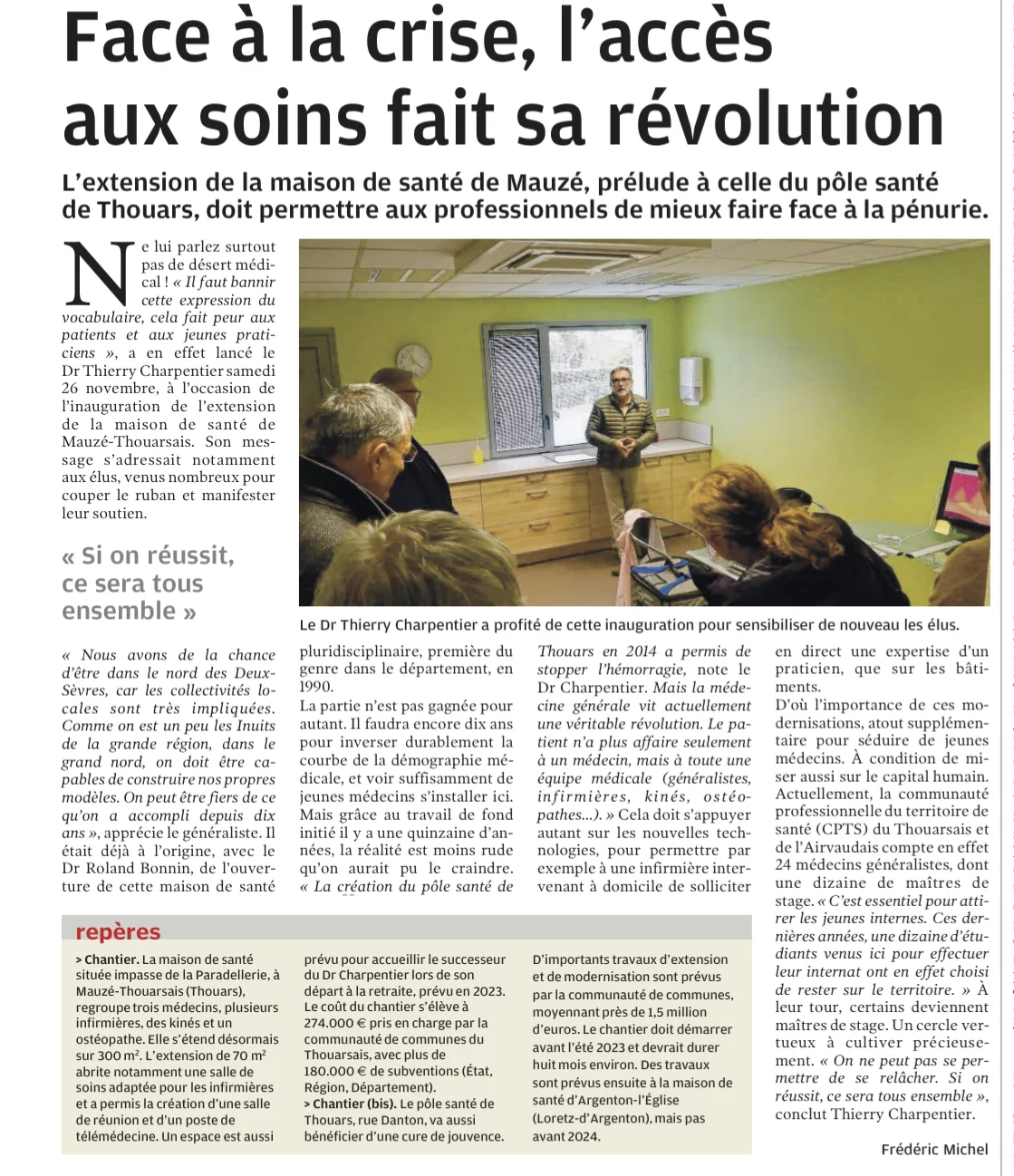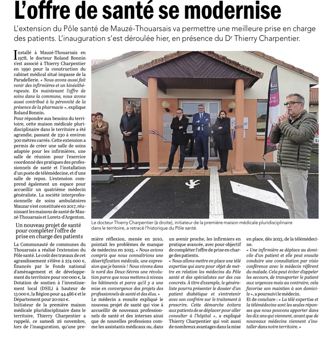 Accueil - Actualités - Presse: Inauguration de l’extension de la maison de santé de Mauzé-Thouarsais Presse: Inauguration de l’extension de la maison de santé de Mauzé-Thouarsais