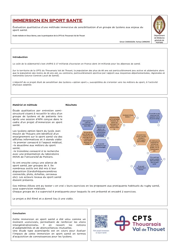 Le second travail s’intitulait « Immersion en sport santé » et faisait état d’une évaluation qualitative d’une méthode immersive de sensibilisation d’un groupe de lycéens aux enjeux du sport santé. Un travail de thèse en cours mené par Harry Leonard interne sur le territoire de la CPTS, co-dirigé par le Dr Charasson et le Dr Carneiro.