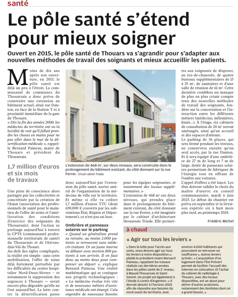 Accueil - Actualités - Thouars : un pôle santé plus grand pour mieux soigner au printemps 2024 Thouars : un pôle santé plus grand pour mieux soigner au printemps 2024 Retrouvez ici l’article de la Nouvelle République du 3/3/23 Slide précédent Slide suivant