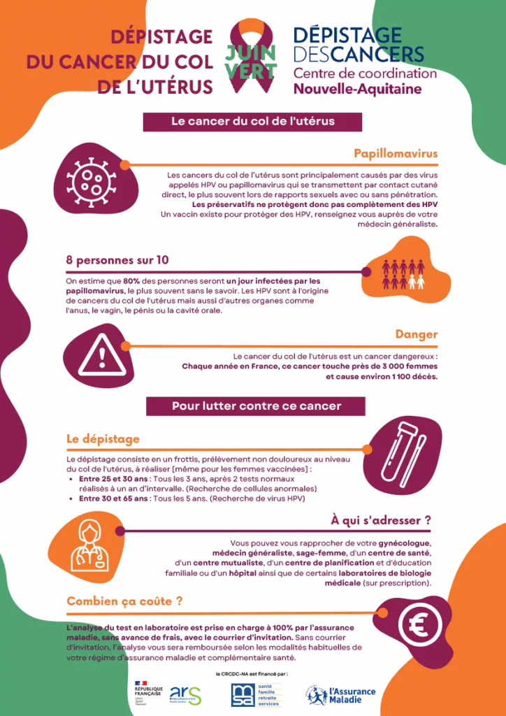 Accueil - Actualités - Juin Vert, Dépistage du cancer du col de l’utérus Juin Vert, Dépistage du cancer du col de l’utérus Plus d'informations sur le site du centre de coordination de dépistage des cancers de Nouvelle-Aquitaine