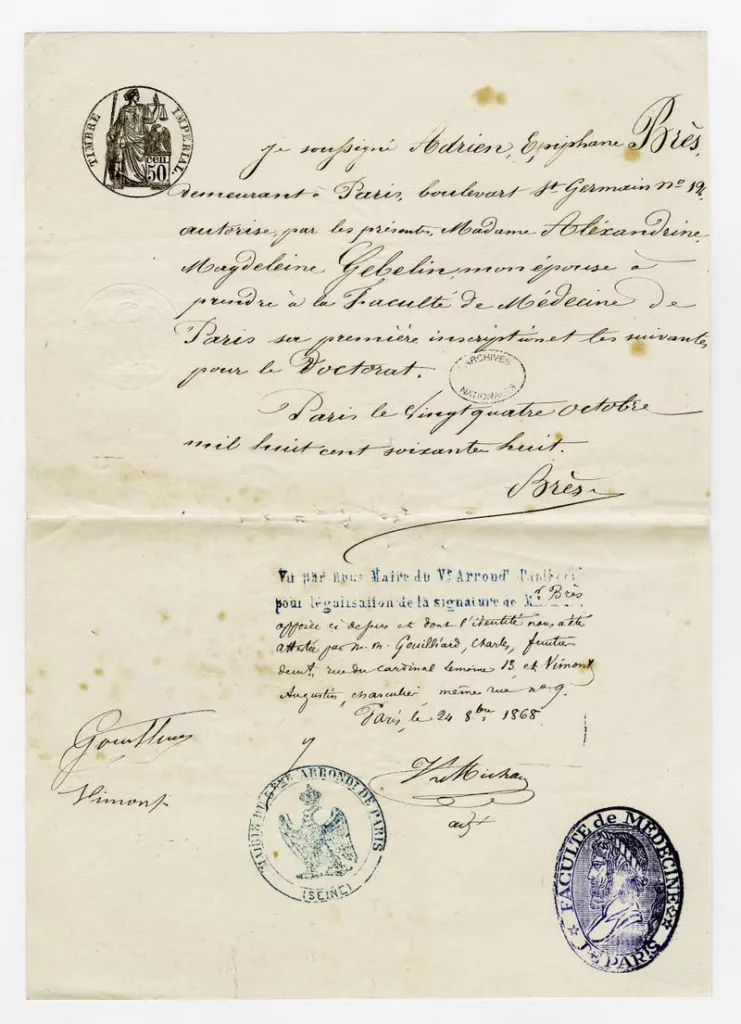 Rien ne prédisposait la jeune femme à ce parcours hors normes : née dans un milieu modeste, elle fait des études sommaires avant de se marier à l’âge de 15 ans avec un conducteur d’omnibus et d’avoir trois enfants. Abandonnée par son mari, à 22 ans elle décide d’entreprendre des études de médecine, mais le doyen de la Faculté de médecine de Paris, Charles-Adolphe Wurtz, pensant sans doute l’éconduire, lui enjoint de passer d’abord les deux baccalauréats. Premiere difficulté à une époque où les lycées de jeunes filles n’avaient pas encore été créés et où celles-ci devaient se satisfaire d’une instruction à vocation mondaine qui ne les préparait pas à l’obtention du diplôme. Pourtant Madeleine Brès devient bachelière -lettres, puis -sciences en 1869 à l’âge de 28 ans grâce au soutien financier de la baronne James de Rothschild. Elle postule à nouveau et le doyen Wurtz, surpris par cette ténacité, en réfère à son ministre Victor Duruy ; lequel tout aussi indécis soulève la question à un conseil des ministres présidé par l’impératrice Eugénie. Nous pouvons donc voir en cette dernière une féministe avant l’heure puisqu’elle appuie chaudement cette candidature en formulant le voeu que d’autres femmes suivent cet exemple.
