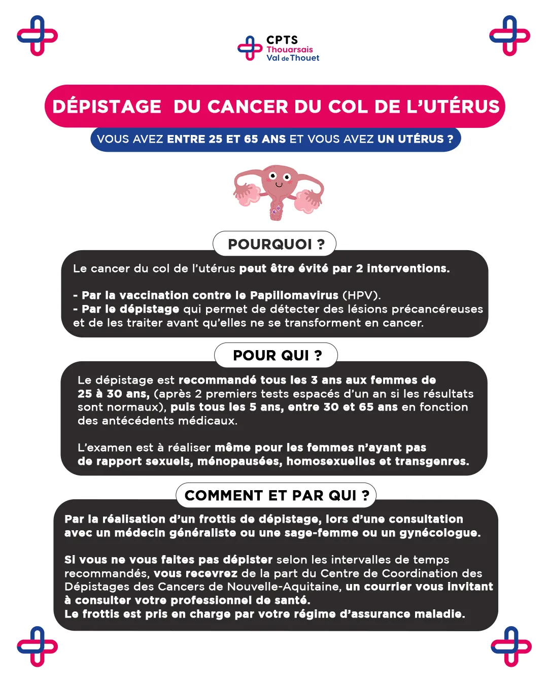Accueil - Conseils - Infographie: DÉPISTAGE DU CANCER DU COL DE L’UTÉRUS Infographie: DÉPISTAGE DU CANCER DU COL DE L’UTÉRUS Retrouvez l'infographie réalisée par les infirmiers ASALEE du secteur sur le dépistage du cancer du col de l'uterus. Fiche Dépistage du cancer du col de l'uterus Fiche Dépistage du cancer du col de l'uterus